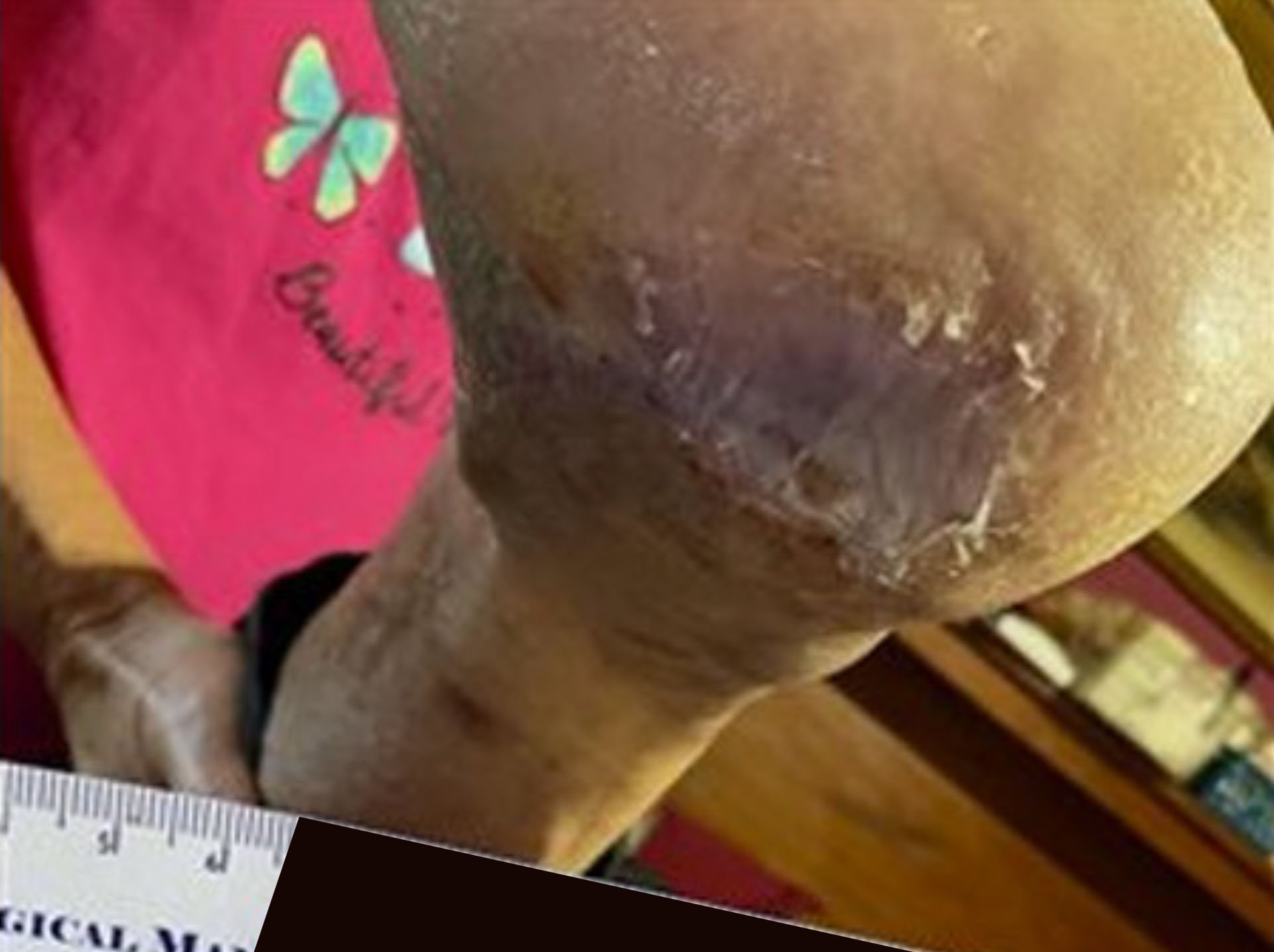 The ulcer was cleansed throughout the course of care with Dermal Wound Cleanser, SKIN‑PREP applied initially for peri wound protection. DermaBind was applied weekly and secured with a contact layer and steri‑strips, then covered with bordered foam and a Kerlix wrap. Offloading with a heel boot was required at all times. Outer dressings could be changed if soiled, provided the contact layer remained undisturbed. As drainage decreased, outer dressings were left in place for the full week. Once the wound approached near‑complete re- epithelialization, therapy transitioned to Collagen Ag+ with foam and gauze for one additional week until full resolution.
